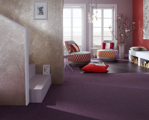 Im Wohnbereich erfährt der Teppichboden eine Renaissance, seit es ihn in kräftigen Farben und aufregenden Designs gibt. Hier entfaltet sich die Wirkung von Farbe am deutlichsten: sonnige Rot- und Gelbtöne laden zum Feiern und Spielen ein, Sahara und Smaragdgrün beruhigen und geben dem Raum ein edles Gepräge. In Kinderzimmern begeistern die bunten Muster.